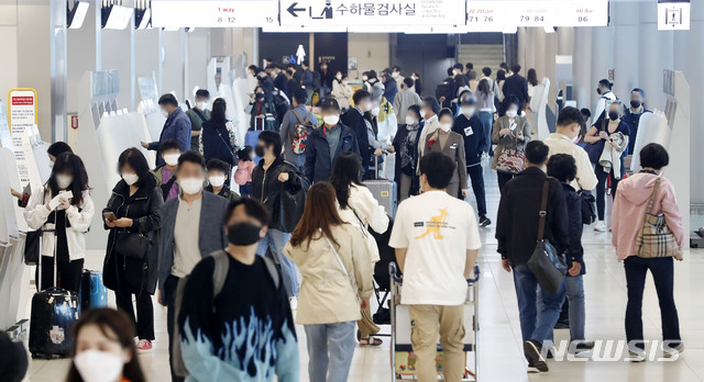 [서울=뉴시스]홍효식 기자 = 휴일인 2일 서울 강서구 김포국제공항 국내선을 찾은 시민들이 탑승 수속을 밟기 위해 이동하고 있다. 2021.05.02. [email protected]