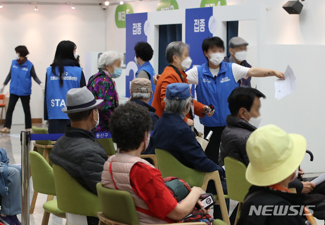 [서울=뉴시스]조수정 기자 = 코로나19 백신 1차 접종자가 누적 367만4729명으로 전 국민의 7.2%, 2차 접종자는 누적 50만 6274명으로 전국민의 1.0%로 집계된 10일 오전 서울 한 코로나19 백신 예방접종센터에서 어르신들이 접종하고 있다. 2021.05.10. [email protected]