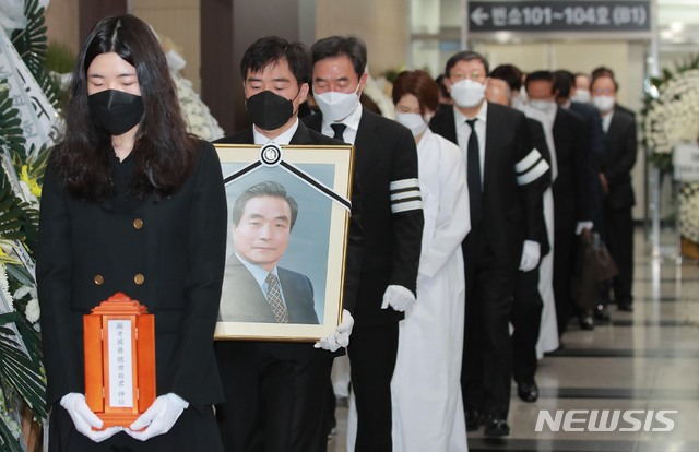 [서울=뉴시스]사진공동취재단 = 고(故) 이한동 전 국무총리의 발인식이 엄수된 11일 오전 서울 광진구 건국대학교병원 장례식장에서 유가족과 관계자들이 고인의 영정을 모시고 있다. 2021.05.11. [email protected]