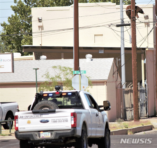 [더글러스=AP/뉴시스]지난 9일(현지시간) 미 애리조나주 더글러스에서 곰 한 마리가 전신주에 올라가 있다. 관계 당국은 이 곰이 결국 아래로 내려와 허둥지둥 달아나면서 모여 있던 20여 명의 구경꾼도 황급히 흩어졌다고 전했다. 2021.05.12.
