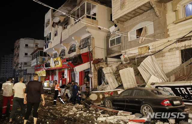 [가자지구=AP/뉴시스]12일 새벽(현지시간) 팔레스타인 가자지구에서 소방관과 젊은이들이 이스라엘군의 공습으로 파괴된 건물을 살피고 있다. 이스라엘은 전날 무장 정파 하마스의 로켓포 공격에 대한 보복으로 가자 지구 공습을 이어갔다. 하마스는 장거리 미사일을 이용해 텔아비브 등의 주거용 건물 등을 타격하겠다고 경고하고 나서 전면전에 대한 우려가 커지고 있다. 2021.05.12.