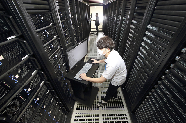 [서울=뉴시스]KT가 서울 구로구에 인터넷데이터센터 ‘KT IDC 남구로’를 열고, 본격적인 가동을 시작했다고 12일 밝혔다. KT IDC 남구로에서 관리 인력들이 서버 상태를 점검하고 있다. (사진=KT 제공) 2021.05.12. [email protected] *재판매 및 DB 금지