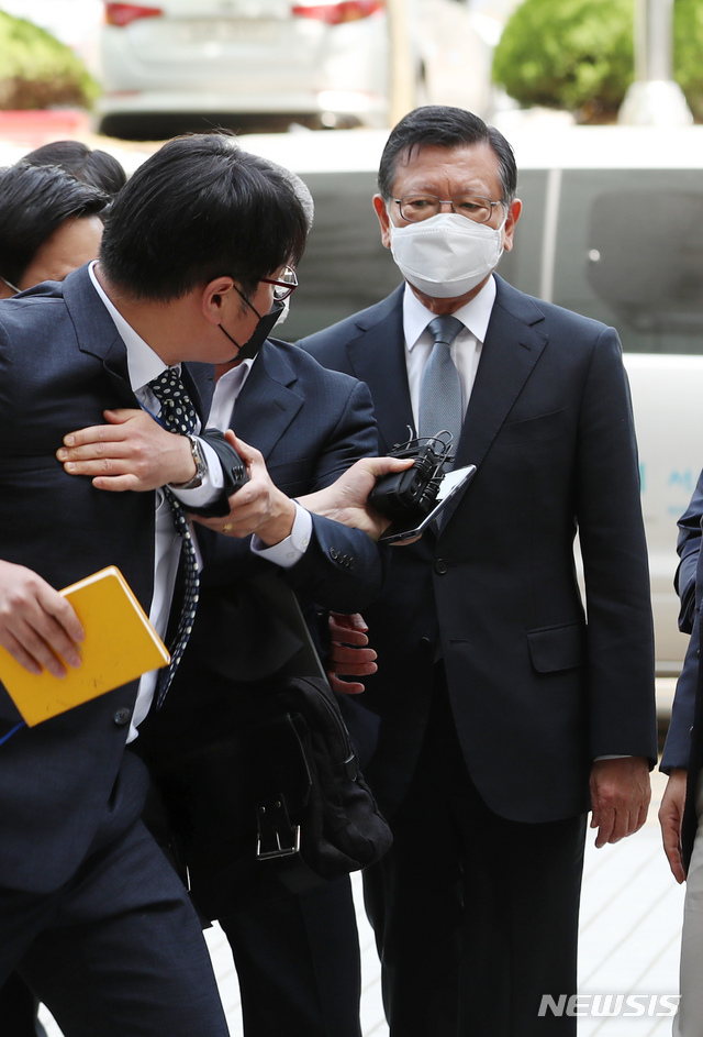 [서울=뉴시스]고승민 기자 = '계열사 부당지원' 의혹을 받고 있는 박삼구 전 금호아시아나 회장이 구속 전 피의자 심문(영장실질심사)을 받기 위해 12일 오전 서울 서초구 서울중앙지법에 들어서고 있다. 2021.05.12. [email protected]