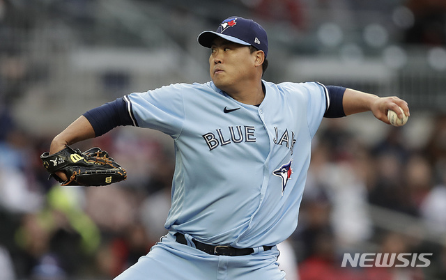 [애틀랜타=AP/뉴시스]토론토 블루제이스의 류현진이 12일(현지시간) 미 조지아주 애틀랜타의 트루이스트 파크에서 열린 2021 메이저리그 애틀랜타 브레이브스와의 원정 경기에 선발 등판해 1회 투구하고 있다. 2021.05.13.