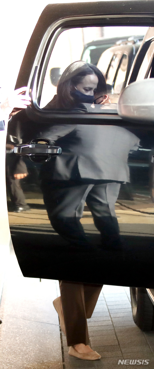 [서울=뉴시스]조수정 기자 = 방한한 애브릴 헤인스 미국 국가정보국(DNI) 국장이 13일 오전 서울 시내 한 호텔을 나서고 있다. 이날 헤인스 국장은 비무장지대(DMZ)과 판문점 공동경비구역(JSA)을 돌아볼 것으로 보도됐다. 헤인스 국장은 미국 중앙정보국(CIA)과 연방수사국(FBI) 등 15개 정보기관을 총괄하는 미국 정보수장이다. 2021.05.13. [email protected]