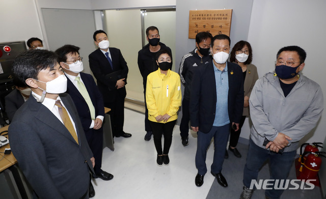 [서울=뉴시스]홍효식 기자 = 이현주(왼쪽) 4·16 세월호 참사 증거자료의 조작·편집 의혹 사건 진상규명을 위한 특별검사가 13일 서울 강남구 세월호 특검 사무소에서 유경근(오른쪽) 세월호 416 가족협의회 집행위원장 등 유가족들과 면담을 마친 후 배웅하고 있다. 2021.05.13. [email protected]