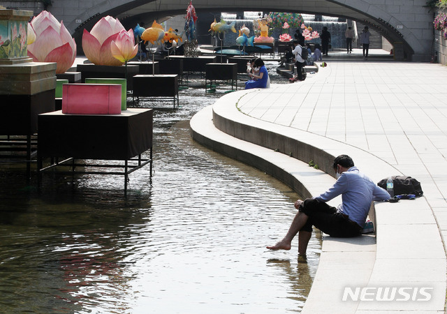 [서울=뉴시스]박주성 기자 = 서울 낮 기온이 29도까지 올라 초여름 날씨를 보인 13일 오후 서울 청계천에서 한 시민이 물에 발을 담그고 더위를 식히고 있다. 2021.05.13. [email protected]