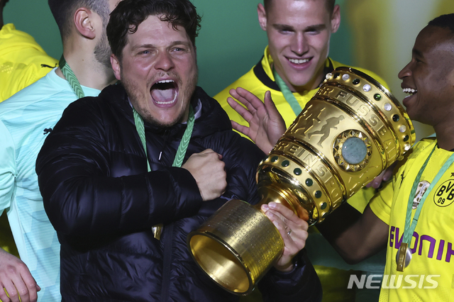 [베를린=AP/뉴시스]도르트문트의 에딘 테르지치 감독이 13일(현지시간) 독일 베를린의 올림픽 슈타디온에서 열린 2020-21 독일 축구컵(DFB 포칼) RB 라이프치히와의 결승전에서 승리, 우승컵을 들고 선수들과 기뻐하고 있다. 도르트문트는 라이프치히를 4-1로 물리치고 우승했다. 2021.05.14.