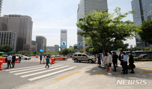 [서울=뉴시스]박주성 기자 = 서울의 한 낮의 기온이 30도까지 오른 14일 오후 서울 광화문 사거리에 시민들이 횡단보도를 건너기 전 나무그늘을 찾아 햇볕을 피하고 있다. 2021.05.14. [email protected]