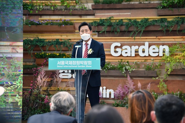 [서울=뉴시스]오세훈 서울시장이 14일 서울 중구 손기정체육공원에서 열린 '서울국제정원박람회 개막식'에 참석해 인사말을 하고 있다. (사진=서울시 제공) 2021.05.14. [email protected] *재판매 및 DB 금지