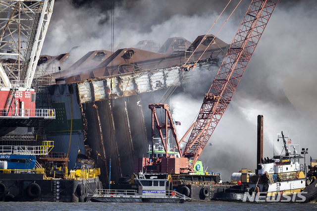 [브런스윅=AP/뉴시스]14일(현지시간) 미 조지아주 브런스윅의 세인트사이먼스 인근 해상에서 소방관들이 해체 작업 중인 화물선 '골든 레이'에 물을 뿌리고 있다. 길이 약 200m에 달하는 한국의 현대 글로비스 소속 화물선 '골든 레이'는 차량 4200여 대를 실은 채 2019년 9월 8일 조지아주 해안에서 전복돼 거대 갠트리 기중기로 해체되고 있다. 2021.05.15.