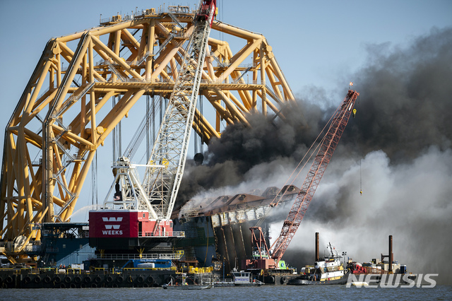 [브런스윅=AP/뉴시스]14일(현지시간) 미 조지아주 브런스윅의 세인트사이먼스 인근 해상에서 소방관들이 해체 작업 중인 화물선 '골든 레이'에 물을 뿌리고 있다. 길이 약 200m에 달하는 한국의 현대 글로비스 소속 화물선 '골든 레이'는 차량 4200여 대를 실은 채 2019년 9월 8일 조지아주 해안에서 전복돼 거대 갠트리 기중기로 해체되고 있다. 2021.05.15.