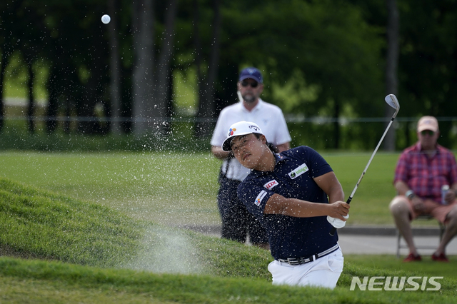 [매키니=AP/뉴시스]이경훈이 15일(현지시간) 미 텍사스주 매키니의 TPC 크레이그 랜치에서 열린 미국프로골프(PGA) 투어 AT&T 바이런 넬슨 3라운드 18번 그린에서 벙커샷을 하고 있다. 이경훈은 중간합계 19언더파 197타로 선두 샘 번스(미국)에 1타 뒤진 단독 2위로 올라섰다. 2021.05.16.