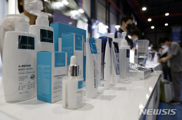 [서울=뉴시스]고승민 기자 = 16일 서울 강남구 SETEC에서 열린 2021 대한미용성형레이저의학회 미용의료기기 박람회 및 춘계학술대회를 찾은 관람객이 화장품 등을 살펴보고 있다. 2021.05.16. [email protected]