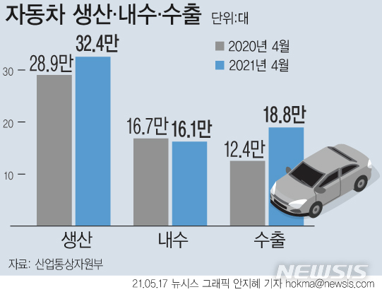 [서울=뉴시스] 17일 산업통상자원부에 따르면 지난 4월 자동차 생산 대수는 전년 대비 11.8% 늘어난 32만3644대로 집계됐다. 수출은 18만8293대로 전년 대비  52.8% 증가했다. (그래픽=안지혜 기자)