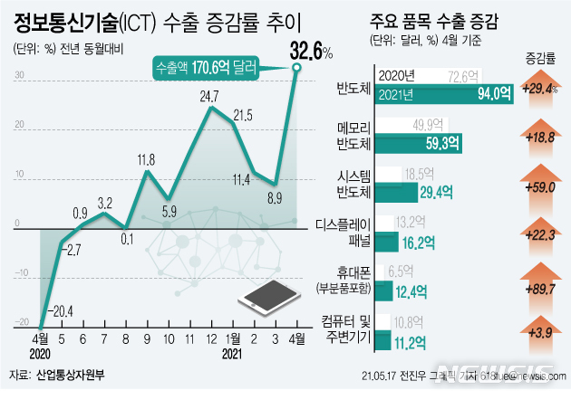 [서울=뉴시스] 17일 산업통상자원부에 따르면 4월 정보통신기술(ICT)수출액은 170.6억 달러로 전년 대비 32.6% 늘어 11개월째 증가세를 이어갔다. (그래픽=전진우 기자)
