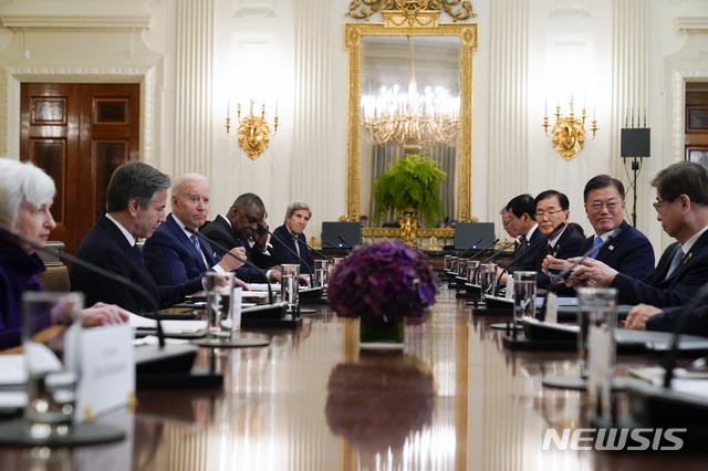 [워싱턴=AP/뉴시스]문재인(오른쪽 두 번째) 대통령이 21일(현지시간) 백악관 국빈만찬장에서 조 바이든 미국 대통령과 확대 회담하고 있다. 2021.05.22.