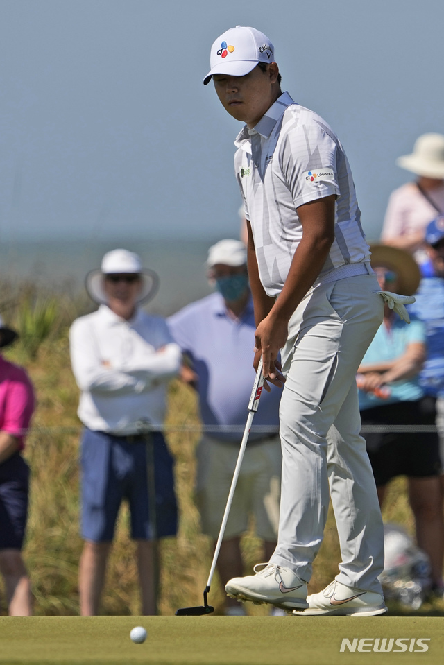 [찰스턴=AP/뉴시스]김시우가 21일(현지시간) 미 사우스캐롤라이나주 찰스턴 인근 키아와 아일랜드 오션 코스에서 열린 PGA 챔피언십 2라운드 14번 그린에서 퍼팅하고 있다. 김시우는 7오버파 141타 공동 95위, 직전 대회인 AT&T 바이런 넬슨 우승자 이경훈은 11오버파 155타 공동 127위로 컷 탈락했다. 2021.05.22.