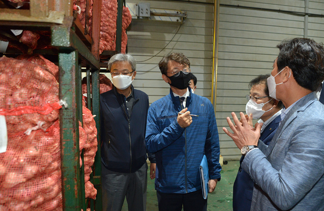 [서귀포=뉴시스]강종민 기자 = 노지채소 산지동향 점검에 나선 박영범 농림축산식품부 차관이 28일 제주도 서귀포시 대정농협 PC에서 마늘, 저장시설을 살펴보고 있다. (사진=농식품부 제공) 2021.05.28. [email protected] *재판매 및 DB 금지