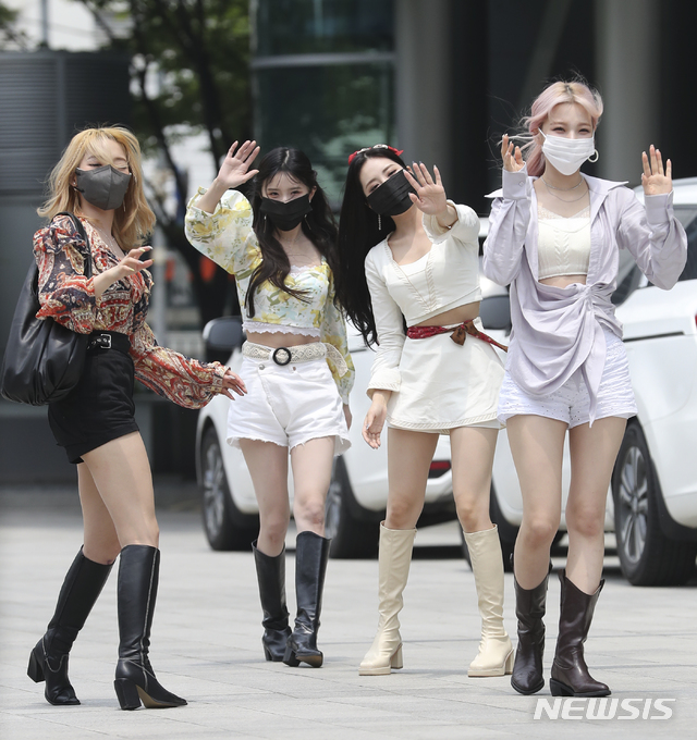 [서울=뉴시스]최진석 기자 = 그룹 프로미스나인(fromis_9)의 노지선(왼쪽부터), 송하영, 박지원, 백지헌이 1일 오후 서울 양천구 목동 SBS에서 진행된 라디오 ‘최화정의 파워타임’에 출연을 위해 이동하며 포즈를 취하고 있다. 2021.06.01. [email protected]