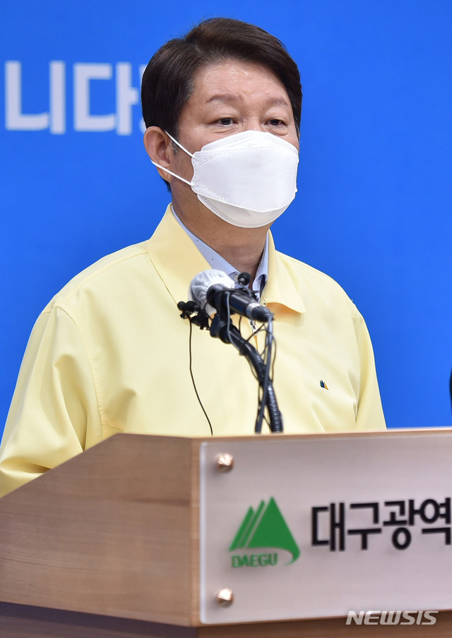 [대구=뉴시스]이무열 기자 = 권영진 대구시장이 8일 오후 대구시청 브리핑룸에서 코로나19 '화이자 백신 독자 구입' 논란 관련 사과문을 발표하고 있다. 2021.06.08. [email protected]