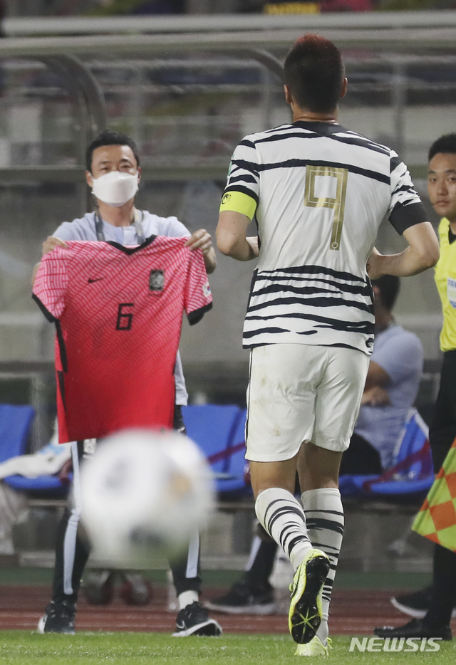 [고양=뉴시스]최진석 기자 = 9일 오후 경기 고양시 고양종합운동장에서 열린 2022년 FIFA 월드컵 아시아 지역 2차 예선 대한민국과 스리랑카의 경기, 대한민국 김신욱이 골을 넣은 뒤 유상철 감독 유니폼을 들고 세리머니를 위해 이동하고 있다. 2021.06.09. [email protected]