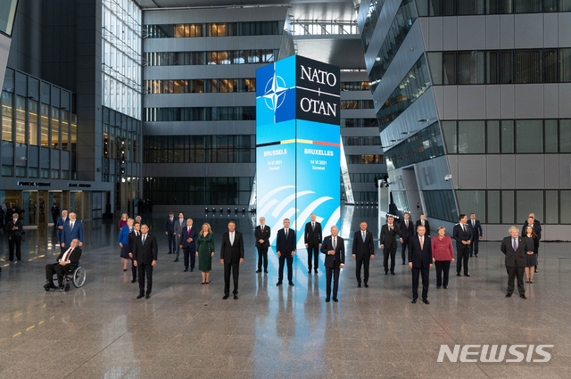 [브뤼셀=AP/뉴시스] 나토(북대서양조약기구) 회원 30개국 정상들은 14일(현지시간) 브뤼셀에서 회의를 열어 중국, 러시아와 긴장상황 등에 관해 논의하고 공동성명을 발표했다. 조 바이든 미국 대통령 등 정상들이 기념촬영을 위해 포즈를 취하고 있다. 2021.06.15