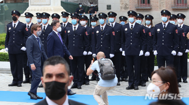[마드리드(스페인)=뉴시스]박영태 기자 = 스페인을 국빈 방문 중인 문재인 대통령이 15일(현지시간) 스페인 마드리드 시청을 방문해 의장대 사열을 받고 있다. 2021.06.16. [email protected]