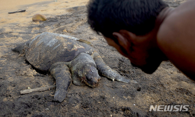 [콜롬보=AP/뉴시스]24일(현지시간) 스리랑카 콜롬보 외곽의 마운트 라비니아 해변에서 한 스리랑카 남성이 해안에 죽은 채 떠내려온 거북이를 바라보고 있다. 스리랑카 해상에서 컨테이너선 엑스 프레스 펄이 화재로 침몰한 이후 대왕고래(흰긴수염 고래)를 비롯해 돌고래 12마리, 목과 등껍질이 손상된 거북이 100여 마리의 사체가 떠밀려와 심각한 해양 재난에 대한 우려가 커지고 있다. 2021.06.24.