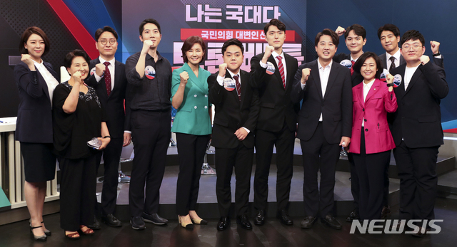 [서울=뉴시스]국회사진기자단 = 국민의힘 이준석 대표가 30일 서울 중구 TV조선 스튜대오에서 열린 국민의힘 대변인 선발을 위한 토론 배틀 '나는 국대다(국민의힘 대변인이다)' 8강전 참여자들과 기념촬영을 하고 있다. 2021.06.30. [email protected]