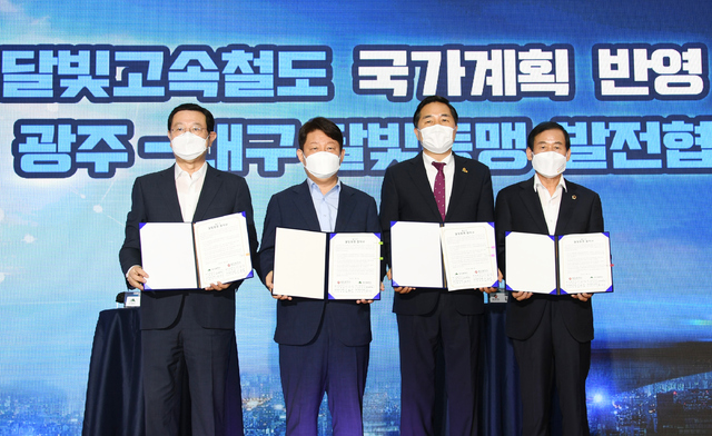 [광주=뉴시스]송창헌 기자 = 이용섭 광주시장과 권영진 대구시장이 6일 오후 달빛고속철도의 출발점인 광주역에서 열린 '2021 달빛동맹 발전협약식'에 참석해 업무협약을 체결한 뒤 김용집 광주시의회 의장, 장상수 대구시의회 의장과 기념촬영을 하고 있다.(사진=광주시 제공) 2021.07.06 [email protected]