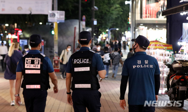 [서울=뉴시스] 추상철 기자 = 코로나19 확진자가 6개월만에 1000명(오후6시 기준)을 넘어선 6일 오후 서울 마포구 홍대거리에서 경찰이 불법영업 단속 및 범죄예방 순찰을 하고 있다. 2021.07.06. [email protected]
