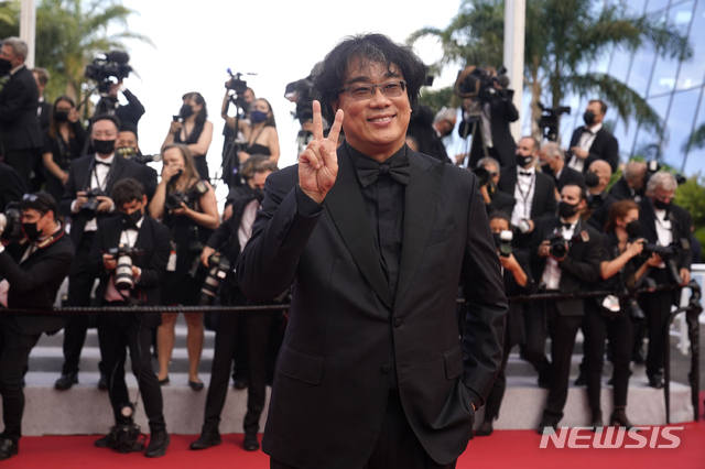[칸=AP/뉴시스]봉준호 감독이 6일(현지시간) 프랑스 휴양도시 칸에서 개막한 제74회 칸 국제 영화제에 참석해 레드 카펫에 올라 포즈를 취하고 있다. 봉준호 감독은 이날 미국 배우 조디 포스터, 스페인 영화감독 페드로 알모도바르, 미국 영화감독 스파이크 리와 함께 칸 영화제 개막을 선언했다. 2021.07.07.