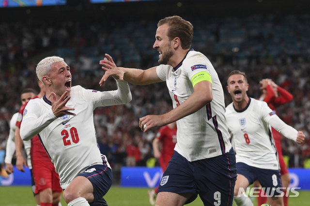 [런던=AP/뉴시스] 잉글랜드의 해리 케인이 7일(현지시간) 영국 런던의 웸블리 경기장에서 열린 유로 2020 덴마크와의 준결승전 연장 전반 막판 결승 골을 넣고 동료들과 환호하고 있다. 잉글랜드는 덴마크를 연장 끝 2-1로 물리치고 사상 처음으로 결승에 진출해 53년 만에 우승을 노리는 이탈리아와 우승을 다툰다. 2021.07.08.