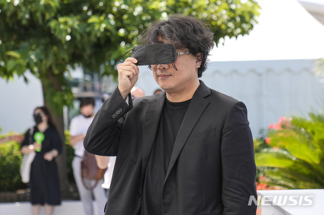 [칸=AP/뉴시스] 봉준호 감독이 7일(현지시간) 프랑스 남부 칸에서 열린 제74회 칸 국제영화제 관객과의 대화 '랑데부 아베크' 참석 전 포토콜 행사 중 검정 마스크로 눈을 가려 영화 '기생충' 포스터의 흉내를 내고 있다. 2021.07.08.