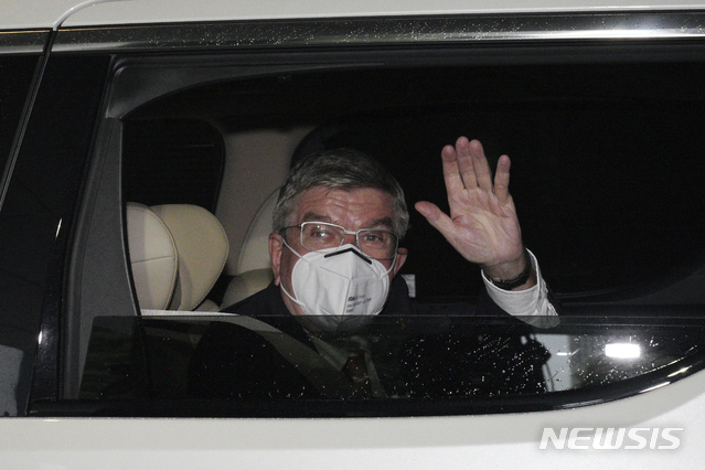 [도쿄=AP/뉴시스] 토마스 바흐 국제올림픽위원회(IOC) 위원장이 8일 일본 도쿄에 도착해 차량에 탑승한 후 기자들에게 손을 흔들고 있다. 바흐 위원장은 일본 도착 후 3일간 호텔에서 자가격리에 들어가 이날 오후 열리는 일본 정부와 도쿄도, 도쿄올림픽·패럴림픽 조직위원회, IOC, 국제패럴림픽위원회(IPC) 등의 5자 회의에 온라인으로 참석한다. 2021.07.08.