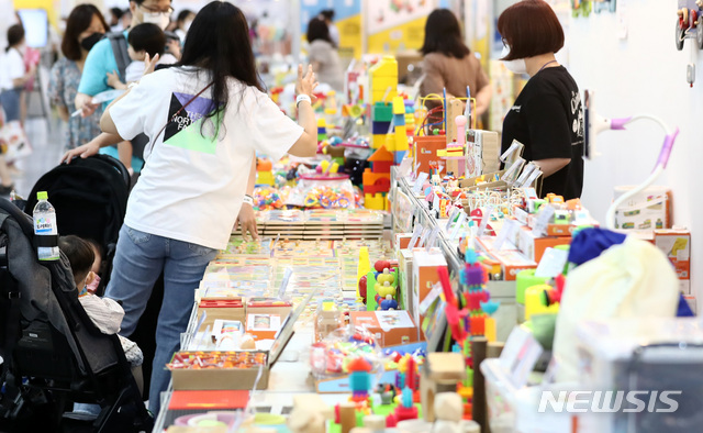 [서울=뉴시스] 이영환 기자 = 8일 오후 서울 강남구 코엑스에서 열린 서울국제유아교육전&키즈페어를 찾은 시민들이 장난감을 살펴보고 있다. 2021.07.08. [email protected]