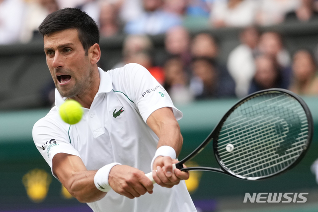 [런던=AP/뉴시스] 노바크 조코비치(1위·세르비아)가 9일(현지시간) 영국 런던 윔블던의 올잉글랜드클럽에서 열린 윔블던 테니스 대회 남자 단식 4강전 데니스 샤포발로프(12위·캐나다)와 경기하고 있다. 조코비치는 샤포발로프를 세트스코어 3-0(7-6<7-3> 7-5 7-5)으로 제치고 결승에 올라 마테오 베레티니(9위·이탈리아)와 우승을 다툰다. 2021.07.10.