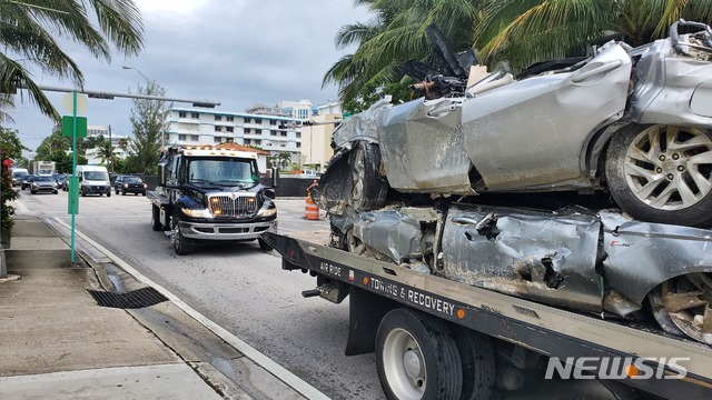 [서프사이드(미 플로리다주)=AP/뉴시스]미 플로리다주 서프사이드의 무너진 챔플레인 타워 사우스 아파트 잔해 속에서 꺼내진 차량들이 10일(현지시간) 옮겨지고 있다. 미국 플로리다주 서프사이드에서 발생한 아파트 붕괴 사고 사망자가 86명으로 늘었다고 다니엘라 레빈 카바 마이애미-데이드 카운티 시장이 10일(현지시간) 밝혔다. 2021.7.11