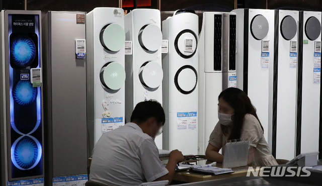 [서울=뉴시스] 백동현 기자 = 기온과 습도가 함께 높아지는 '찜통 더위'가 이틀 연속 이어진 14일 오후 서울 용산구 롯데하이마트 용산아이파크몰점에서 한 시민이 구매 상담을 받고 있다. 오는 20일부터 한반도에 '열돔 현상'으로 인한 강력한 폭염이 찾아오면서 열대야도 기승을 부릴 것으로 전망된다. 2021.07.14 [email protected]