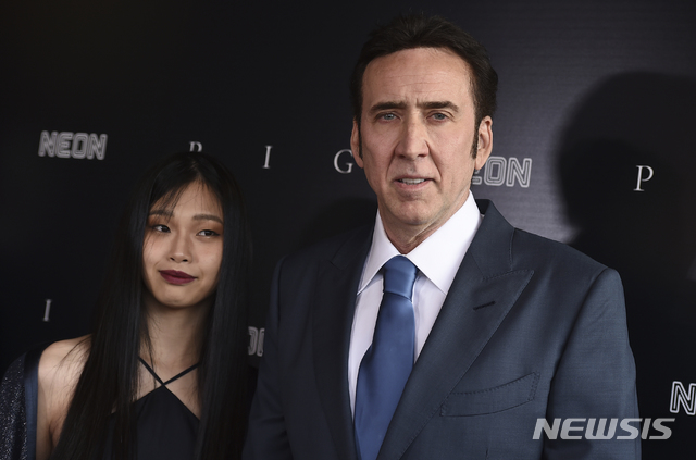 [로스앤젤레스=AP/뉴시스] 배우 니콜라스 케이지(56·오른쪽)가 일본계 부인 리코 시바타(26)와 함께 13일(현지시간) 미 캘리포니아주 로스앤젤레스의 누아트 극장에서 열리는 영화 '돼지'(Pig) 시사회장에 도착하고 있다. 2021.07.15.