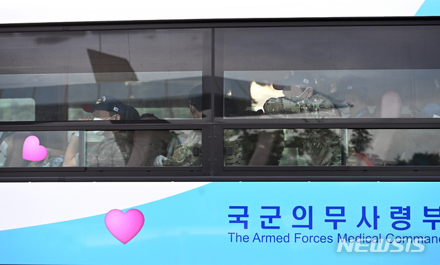 [이천=뉴시스] 김종택기자 = 코로나19 집단감염으로 귀국한 청해부대 34진 문무대왕함의 장병들이 20일 오후 경기도 이천시 국방어학원에 마련된 생활치료센터로 들어가고 있다. 2021.07.20.