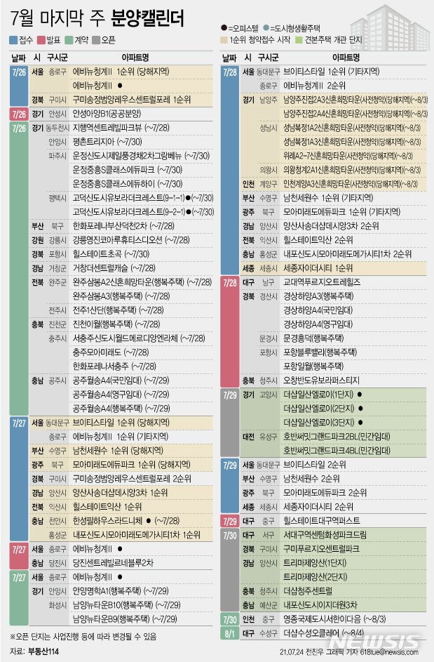 [서울=뉴시스] 24일 부동산114에 따르면 7월 마지막 주에는 전국 18개 단지에서 총 7999가구(일반분양 6601가구)가 분양을 시작한다. (그래픽=전진우 기자)