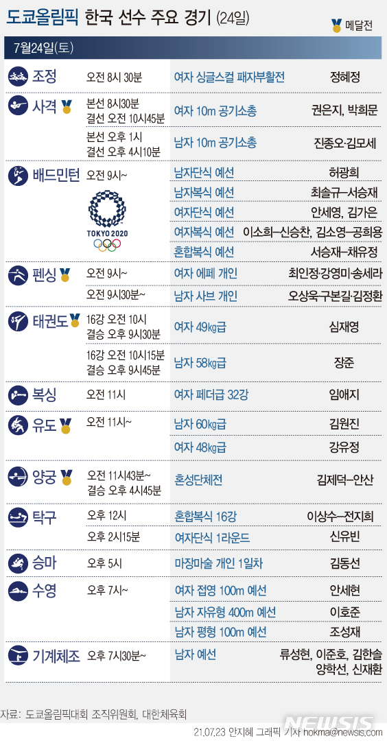 [그래픽] 도쿄올림픽 한국 선수 주요 경기 (7월24일)