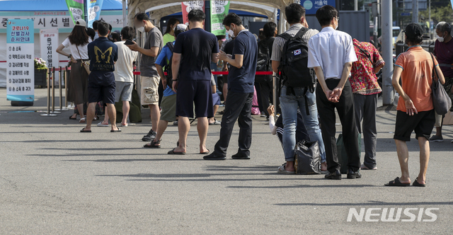 [서울=뉴시스] 정병혁 기자 = 0시 기준 국내 코로나19 신규 확진자가 1629명으로 집계된 24일 서울역 광장에 설치된 중구 임시선별검사소를 찾은 시민들이 검사를 받기 위해 줄 서 있다. 2021.07.24. [email protected]