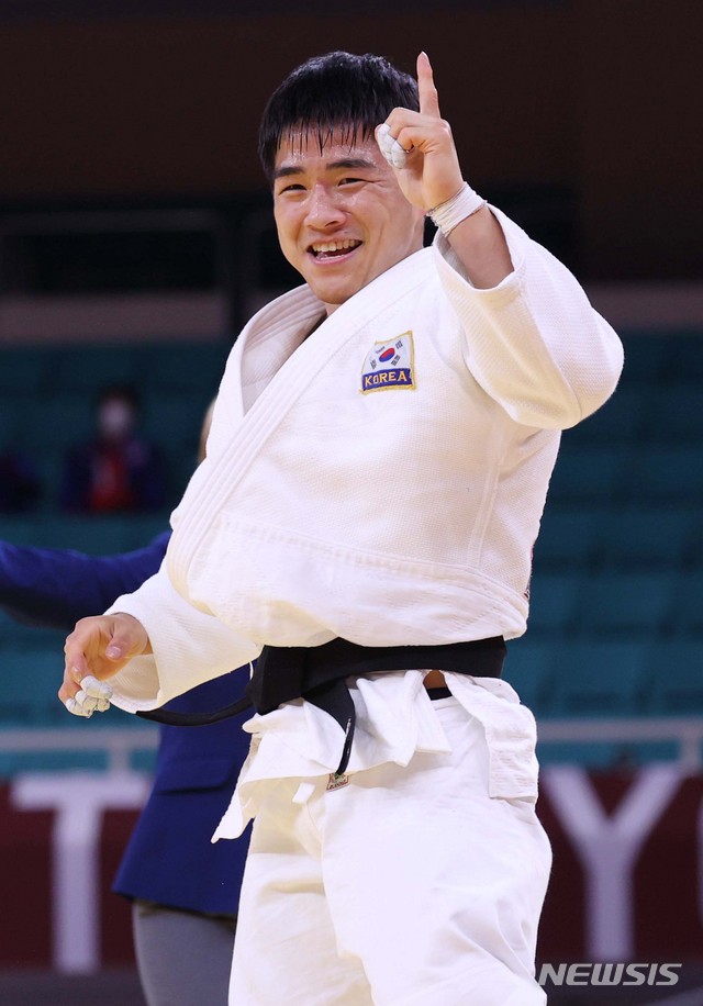 [도쿄(일본)=뉴시스] 최진석 기자 = 안창림이 26일 오후 도쿄 일본무도관에서 열린 2020 도쿄올림픽 유도 남자 73kg급 8강에서 이스라엘의 부트불을 연장 승부끝에 안다리 절반으로 승리를 거두며 준결승에 진출 한 뒤 기뻐하고 있다. 2021.07.26. [email protected]