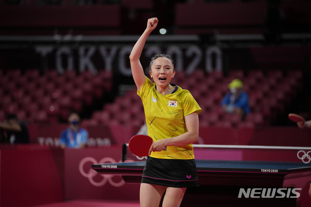 [도쿄=AP/뉴시스] 전지희가 27일 일본 도쿄의 도쿄체육관에서 열린 탁구 여자단식 3라운드 유안 지아난(95위·프랑스)과 경기하고 있다. 전지희는 지아난을 세트 스코어 4-3(12-10 11-4 8-10 11-7 8-11 8-11 11-4)으로 물리치고 16강에 올라 지아 리우(108위·오스트리아)와 8강행을 다툰다. 2021.07.27.