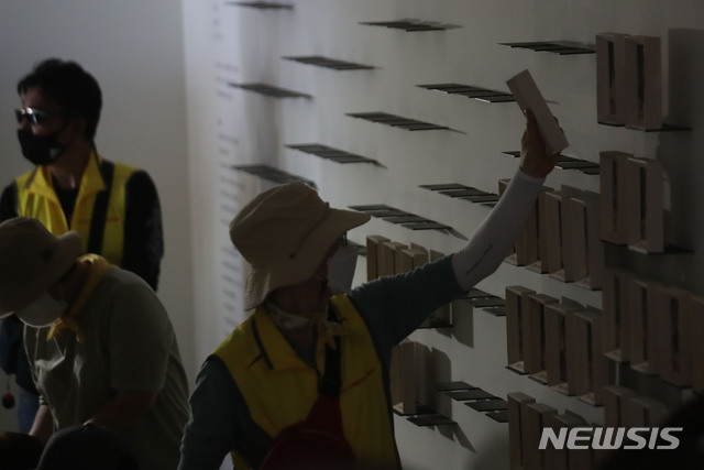 [서울=뉴시스] 고범준 기자 = 27일 오전 서울 광화문광장 세월호 기억공간에서 세월호 유가족들이 희생자들의 사진을 옮기고 있다. 이날 기억공간에서 정리된 물품들은 서울시의회 임시공간으로 옮겨졌다. (공동취재사진) 2021.07.27. [email protected]