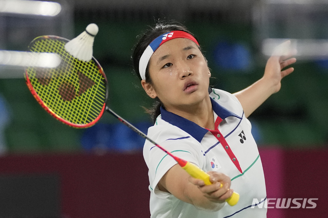 [도쿄=AP/뉴시스] 안세영(8위)이 27일 일본 도쿄의 무사시노노모리 종합 스포츠플라자에서 열린 배드민턴 여자 단식 조별리그 C조 2차전에서 도르카스 아조크 아데소칸(89위·나이지리아)과 경기하고 있다. 안세영은 아데소칸을 세트 스코어 2-0(21-3 21-6)으로 여유 있게 따돌리고 조 1위로 16강에 올라 부사난 옹밤룽판(13위·태국)과 8강 진출을 다툰다. 2021.07.28.