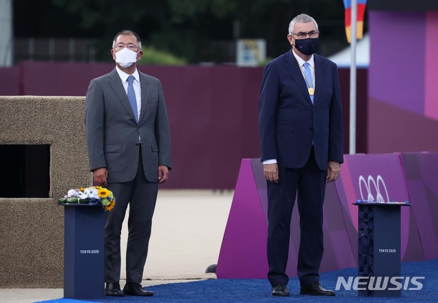 [도쿄(일본)=뉴시스] 최진석 기자 = 정의선 대한양궁협회 회장이 30일 일본 도쿄 유메노시마 양궁장에서 열린 2020 도쿄올림픽 양궁 여자 개인전 메달 시상식에 참석해 있다. 대한민국 양궁 대표팀 안산은 이날 경기에서 금메달을 차지했다. 2021.07.30. [email protected]